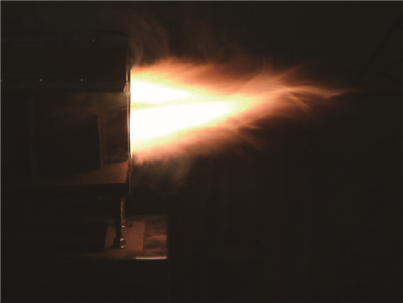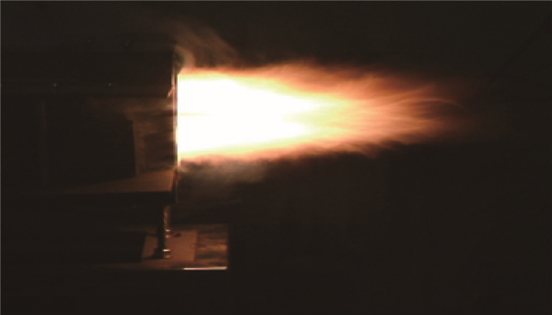 2.3 试验结果及分析 2.3.1 电离种子对射流状态影响比较图 6和图 7可以看出,在外加磁场作用下,当不添加电离种子时,尾喷流在喷出后沿着出口轴线平直状态延伸,喷流火焰状态基本稳定;当添加电离种子后,尾喷流在磁场作用下偏离喷管中心轴线,形成一定角度的射流偏转.金属銫的质量分数为2.5%时,如果只是其本身发生了电离,根据离子碰撞理论可以求出在一个大气压,2 400 K条件下,燃气电离度只有8.23×10-14,则在电磁场中由离子引起的的动量交换不足以改变主流的动量输运,不能实现主流偏转.这说明当Cs2CO3电离种子进入高温燃烧室之后,强化了燃气电离特性,形成中性离子、电子和离子组成的“低温”等离子体,燃气电离度达到可观的10-4~10-3.燃气等离子体流经试验段时,在磁场作用下呈现出MHD流动控制效果.