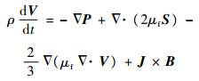 在MHD作用下,等离子体同时服从电磁场方程和流体力学方程,完整的磁流体力学Navier-Stokes方程[14, 15]为