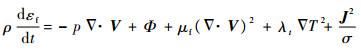 其中:ρ为介质密度;t为时间;p为压强;R为摩尔体积常数;μf为黏度系数;P为应力张量;Φ为耗散系数;∇为哈密顿算子;εf为内能;J为电流密度;S为变形速率;λt为热传导系数.