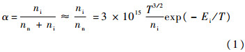 气体在高温中电离,形成带电粒子.电离度可以评估气体的电离能力,定义为单位体积中电离气体粒子数量ni与中性粒子数量nn的比值.电离度α由萨哈方程给出: